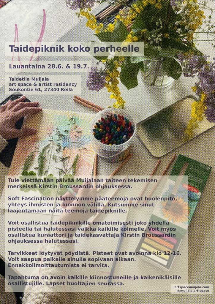 Huolenpito ja yhteys ihmisten ja luonnon välillä ovat kantavia teemoja Soft Fascination -näyttelyn teoksissa. Kutsumme sinut tutkimaan, kokemaan ja laajentamaan tätä teemaa omatoimisten ja luovien aktiviteettien kautta – tällä piknikillä taide on itse eväs! ![]()